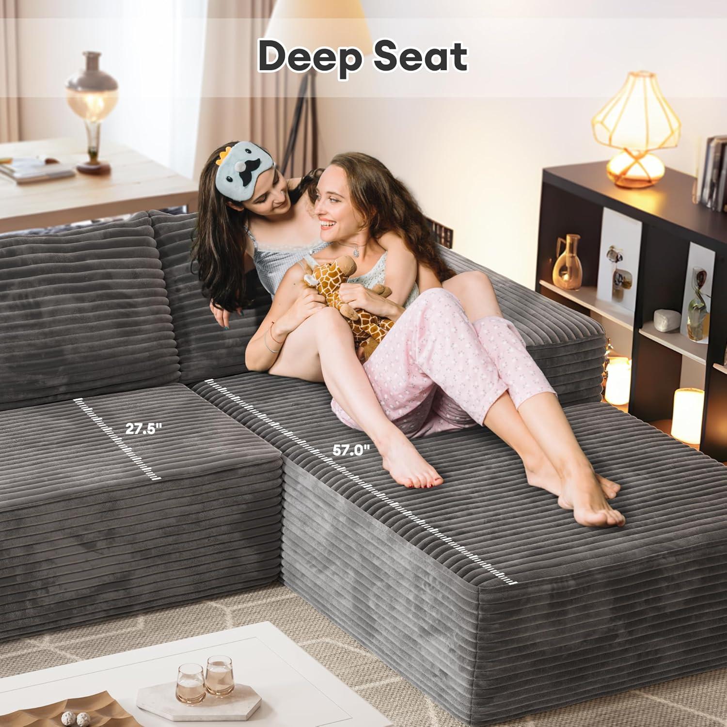 The design of this sectional sofa truly embraces modern minimalism, blending clean lines with a elegant gray velvet upholstery that adds a touch of understated elegance. Its right chaise layout maximizes space usage, while the cloud-soft velvet corduroy fabric provides an inviting texture that feels both breathable and remarkably soft against the skin.The boneless design enhances comfort by inviting you to lounge, meditate, or even lie down as if on a mattress, making every seating position feel effortlessly relaxing.What stands out is the notable depth of the seats – measuring 27.5″ with an extra deep 57″ chaise – which distinctly accommodates taller and larger individuals without compromising on cozy snugness.