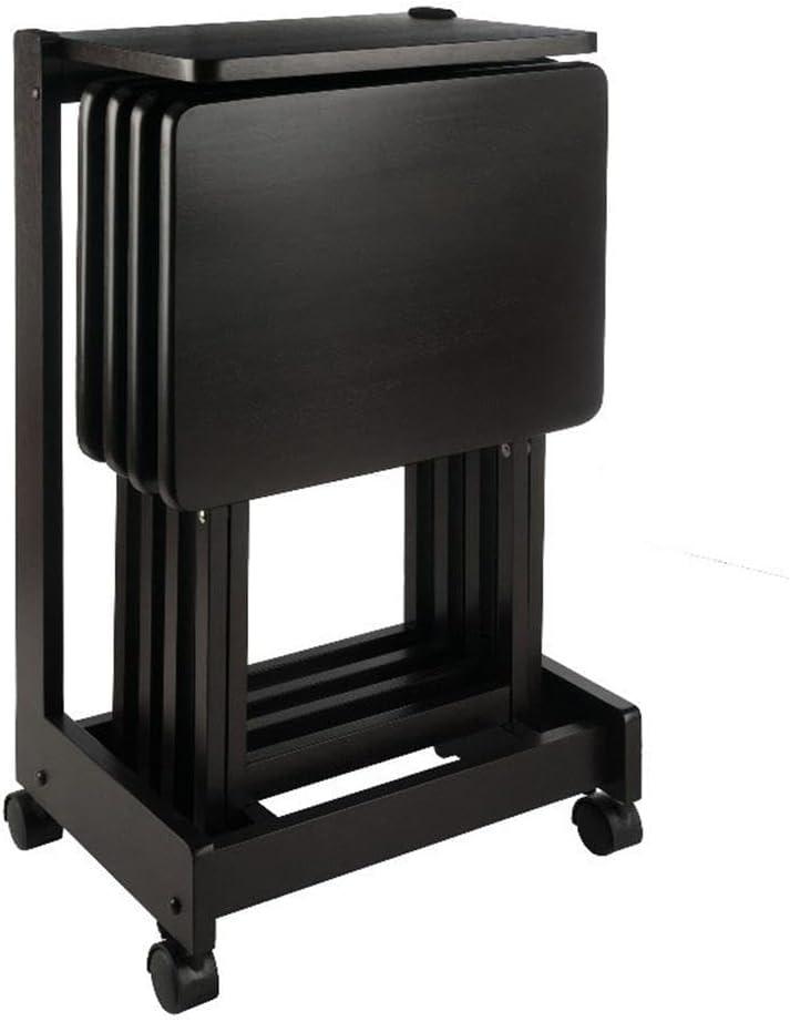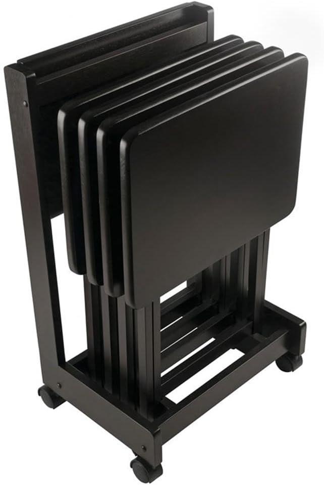 Designed with versatility in mind, this set offers four solid wood snack tables that easily fold flat to fit neatly into a compact storage stand. The standout feature, a flip-top mobile stand finished in a rich coffee tone, adds not only an elegant touch but also practical functionality. The flip-top reveals extra tabletop space ideal for serving or staging snacks and drinks during casual gatherings or relaxed evenings in front of the TV. Mobility is enhanced with four casters on the stand, two of which lock securely to provide stability when needed. This combination of portability and stability impressed us promptly, highlighting how convenience and style can coexist.