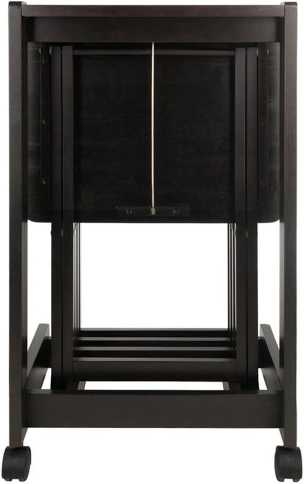 This set’s compact design and portability make it an excellent addition to many room layouts, especially in spaces where versatility is key. Whether arranged around a cozy living room sofa or clustered on a patio, the folding tables offer the convenience of extra surface area without overcrowding the space. As each table folds flat and nests neatly into the mobile stand, it’s simple to tuck them away, keeping the room feeling open and uncluttered. Their solid wood construction in that warm coffee finish complements both modern and conventional decor, adding a subtle touch of elegance that works seamlessly alongside various furniture styles.