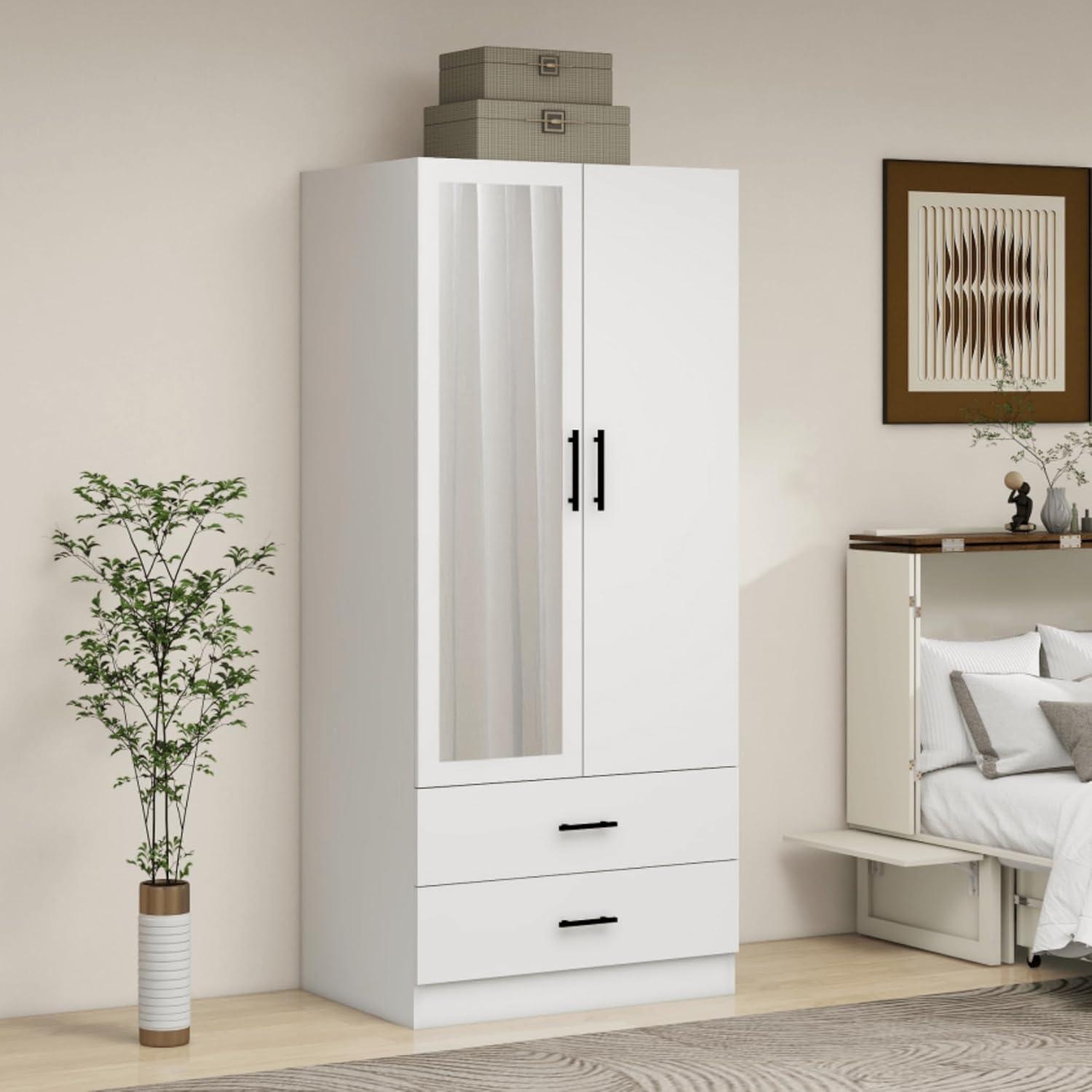 Standing at 71 inches tall, this modern wooden wardrobe offers a thoughtfully designed storage solution that fits seamlessly into a variety of bedroom décors. It combines functionality with style through its sleek, streamlined silhouette crafted from durable, high-quality wood. The full-length mirror integrated into the front panel isn’t just a design choice, but a practical feature that allows us to check our outfits conveniently while organizing. The ample interior space includes two spacious drawers and a sturdy hanging rod, allowing us to store everything from folded clothes to hanging garments with ease.