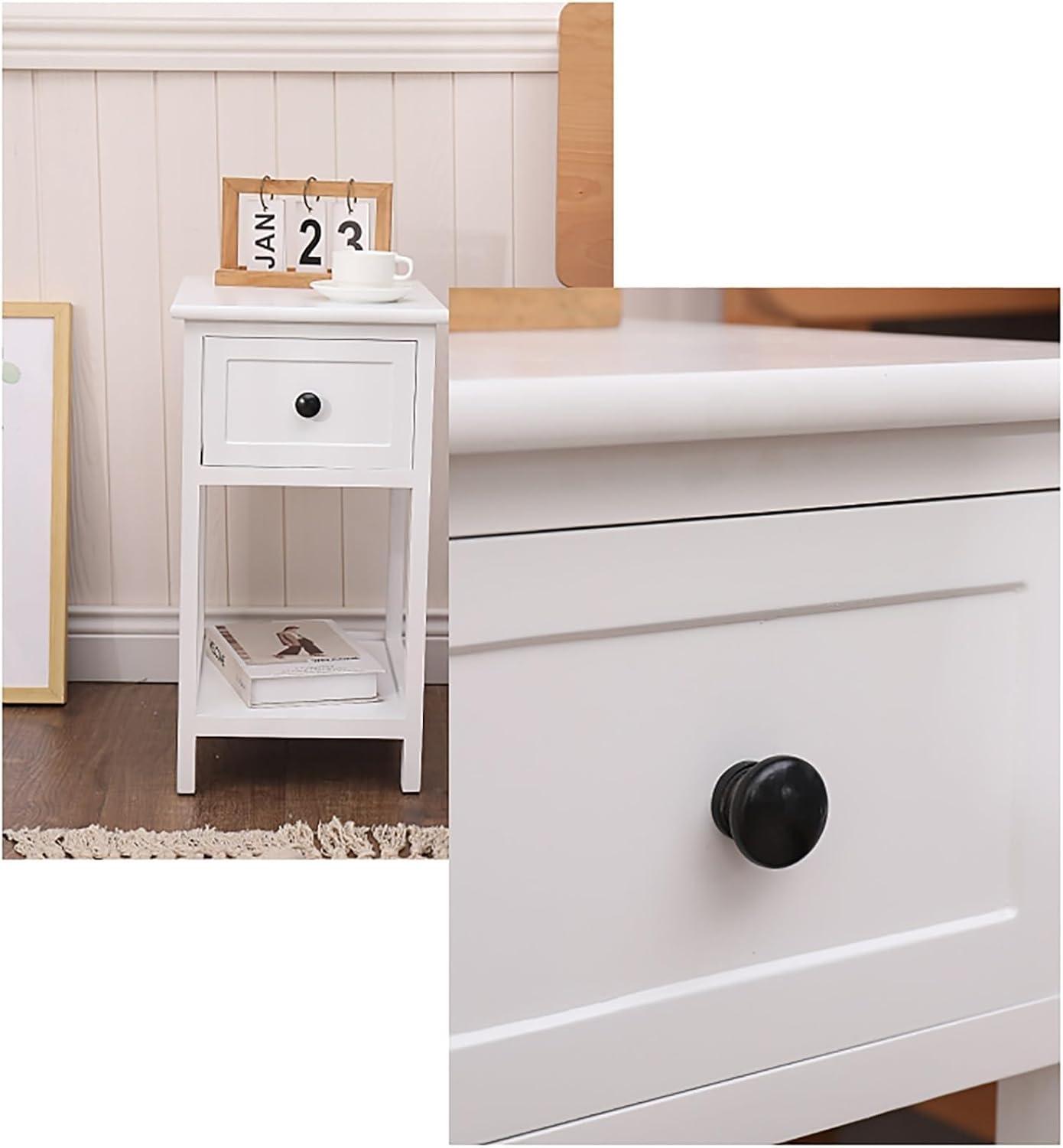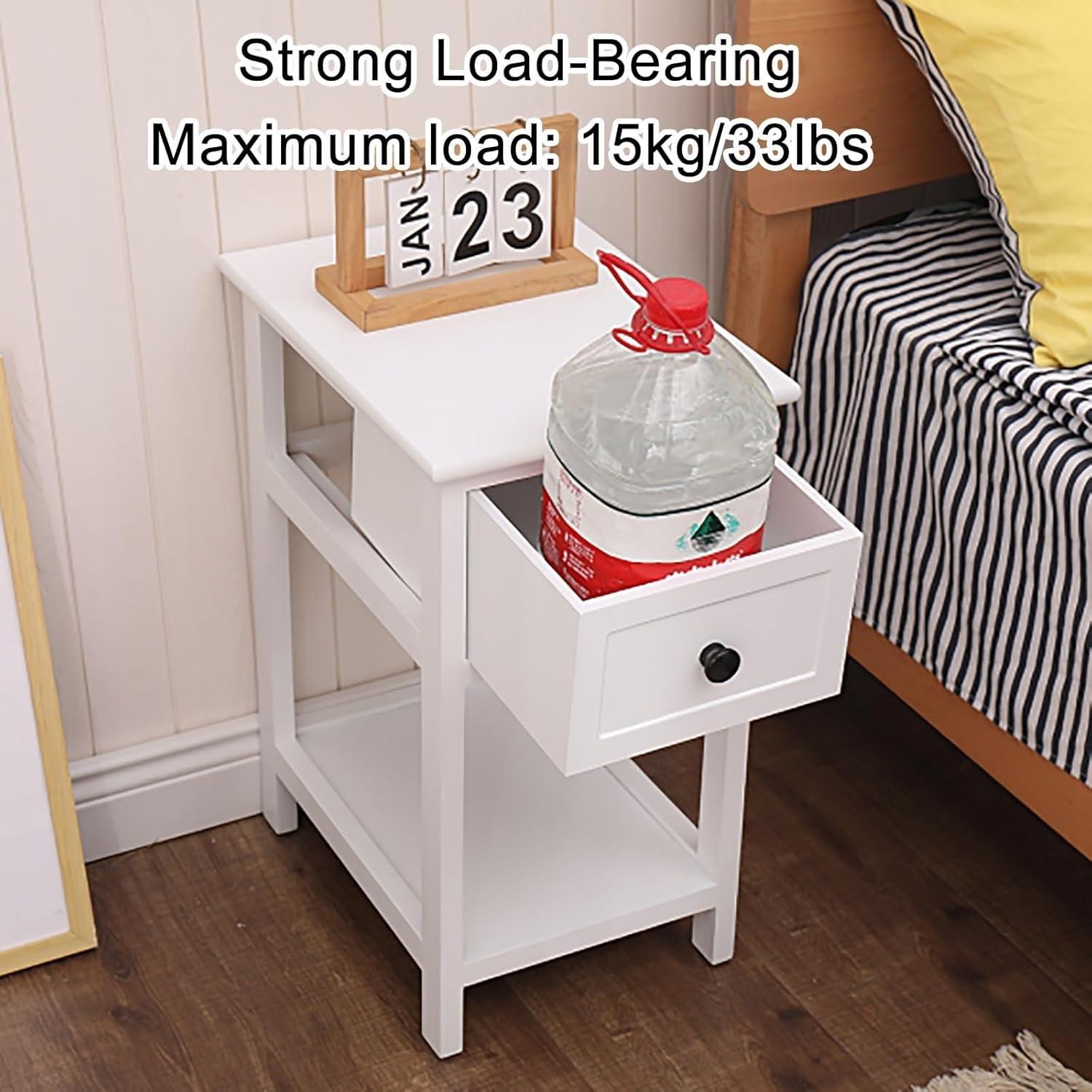 When you place the slim white bedside table in the corner beside the bed, the first thing that registers is its silhouette: narrow and upright, it slips into tight gaps without dominating the sightline.The white finish catches whatever light is in the room, throwing a soft reflection along the top edge and creating a thin shadow where the legs meet the floor. From across the room it reads as a clear, simple plane; up close you notice the small gap between the drawer face and the shelf, and how the straight lines of the sides line up with the headboard or wall depending on how precisely you nudged it into place.